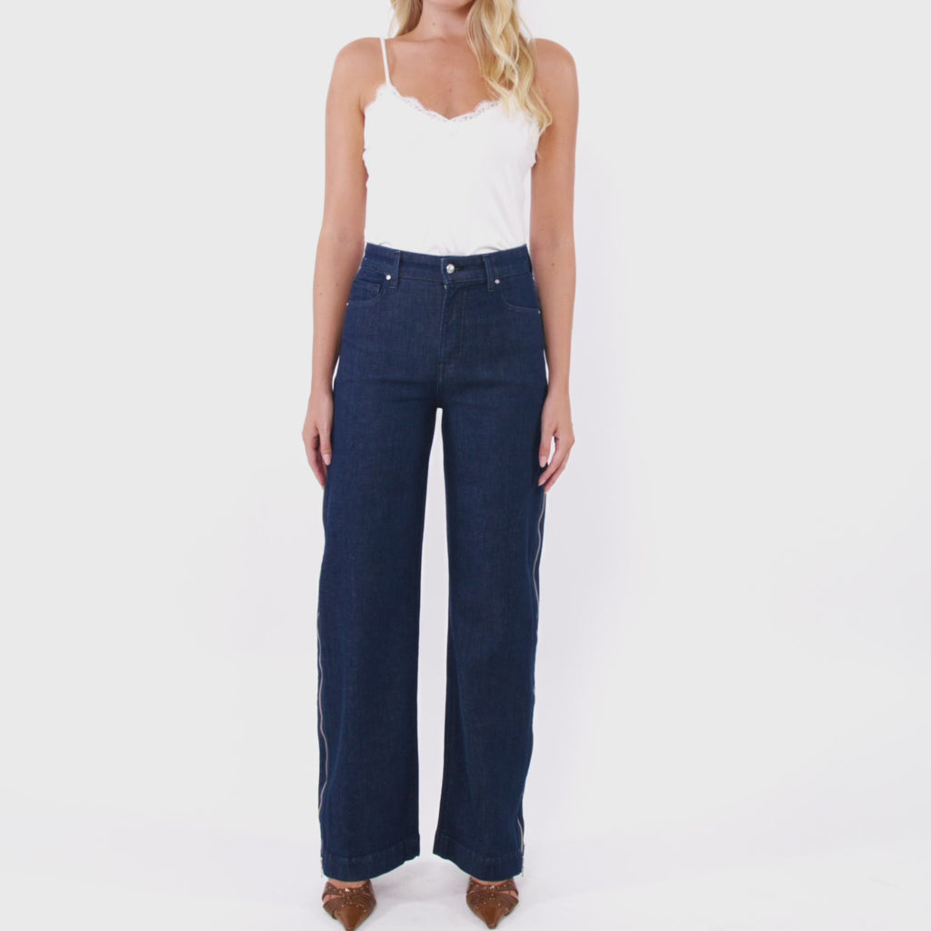 Designed with intention, this denim silhouette features a sleek bronze zipper detail that runs between the hip and knee—an unexpected contrast against the deep, moody wash that commands attention. The zipper isn’t just a design element—it offers versatility. Wear it zipped for a sculpted, tapered look, or unzip to reveal a subtle flare that shifts the mood entirely. Whether you're leaning into sleek minimalism or edge-driven drama, this pair lets you choose your moment—without sacrificing shape or style.