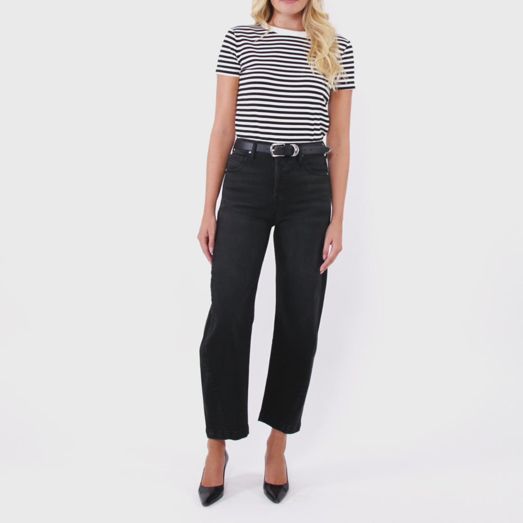 Built from our beloved Gail Barrel Jean, this updated version features a more pronounced mini-barrel silhouette—bold yet endlessly wearable. The cropped, ankle-length cut paired with the commanding 'Noir' wash brings instant edge and excitement to your wardrobe. Style it with tonal accessories and an oversized blazer for a sleek, monochrome moment, or add a pop of contrast for drama that turns heads. All the comfort you love, with even more statement.
